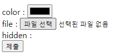<form> color : <input type="color" name="color"> <br> <!-- color=#ff4df9 --> <!-- R G B --> <!-- 실제 파일을 혼자 업로드 X, 단순히 파일 선택을 도와줌 --> file : <input type="file" name="file"> <br> <!-- file=report.pdf --> <!-- 눈에는 보이지 않지만 화면상에는 존재하는 태그 --> hidden : <input type="hidden" name="hidden" value="숨겨진값"> <br> <!-- hidden=숨겨진값 --> <input type="submit" value="제출"> </form>