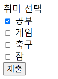 <form> 취미 선택 <br> <input type="checkbox" name="hobby" value="study" checked> 공부 <br> <input type="checkbox" name="hobby" value="game"> 게임 <br> <input type="checkbox" name="hobby" value="football"> 축구 <br> <input type="checkbox" name="hobby" value="sleep"> 잠 <br> <input type="submit" value="제출"> </form>