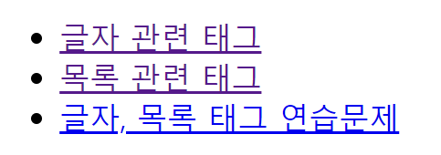 <ul> <li> <a href="01_글자관련태그.html">글자 관련 태그</a> </li> <li> <a href="02_목록관련태그.html">목록 관련 태그</a> </li> <li> <a href="03_글자,목록태그_연습문제.html">글자, 목록 태그 연습문제</a> </li> </ul>
