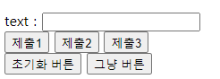 <form> text : <input type="text" name="text"> <br> <input type="submit" value="제출1"> <button type="submit">제출2</button> <button>제출3</button> <br> <!-- 위에보다 자주 쓰는 모양 --> <button type="reset">초기화 버튼</button> <button type="button">그냥 버튼</button> <!-- 그냥 버튼은 javascript를 써야만 사용가능한데 없으면 그냥 모양,,, --> </form>