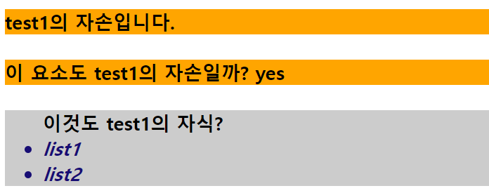 /* 자손(자식) 선택자 */ /* 아이디가 test1인 요소의 자식 중 h4 태그 요소 선택 */ #test1 > h4 { background-color: orange; } /* 아이디가 test1인 요소의 자식 중 ul태그 요소 선택 == #test2 */ #test1 > ul { background-color: #ccc; } /* 아이디가 test1인 요소의 모든 자식 선택 */ #test1 > * { font-weight: bold;} /* 후손 선택자 */ /* 아이디가 test1인 요소의 후손 중 li태그를 모두 선택*/ #test1 li{ font-style : italic; } #test1 > ul > li{ color : rgb(23, 13, 116); }<div id="test1"> test1입니다. <h4>test1의 자손입니다.</h4> <h4>이 요소도 test1의 자손일까? yes</h4> <ul id="test2"> 이것도 test1의 자식? <li> list1 </li> <li> list2 </li> </ul> </div>